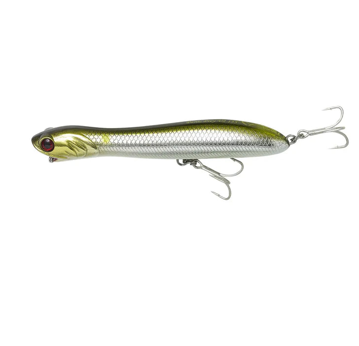 Great Topwater lure, based on details from an anchovy! The open mouth gives great splashing and spitting action on walk the dog retrieve! The long arrow dynamic body, gives incredible casting distance and precision – the rear Y-treble hook folds up along the back on the cast and gives a very stable flight. Inside lazer paper gives superior, live like flash and the easy obtained wide gliding action makes this lure deadly on any top water style of fishing – Saltwater or freshwater. The best panicking prey fish imitation ever!