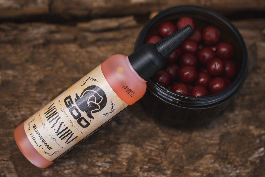 As part of the 10th Phase of Kiana Goo releases we have “distilled” a very special batch of Goo. ‘Moonshine’ Supreme has a grainy, whiskey-style flavour, reminiscent of your favourite tipple from Tennessee, in terms of its look and smell. An old school classic, whiskey flavours have a proven track record for catching carp. Moonshine Supreme Goo contains no alcohol, but you would be forgiven for thinking that the carefully crafted flavour and smell would be at home in a shot glass!