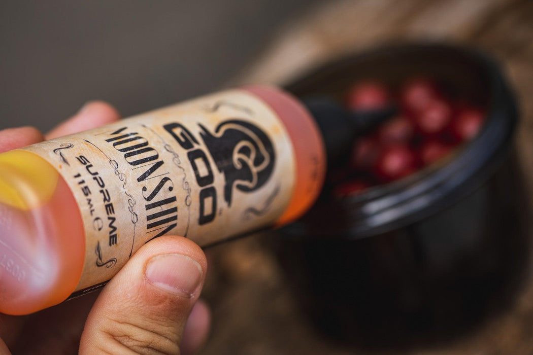 Moving beyond the light-hearted name, Moonshine uses natural blends of ingredients to make up this unique smell and taste profile, and will generate quick bites. Light in colour, and potent in flavour… a quick smell really does hit the back of your throat and takes your breath away, just like a real shot of whiskey. Moonshine Goo Supreme is great for soaking into pop-ups and wafters, which can be used in any water temperature. PLUS why not try a shot of ‘Moonshine’ in your Solidz PVA bags.