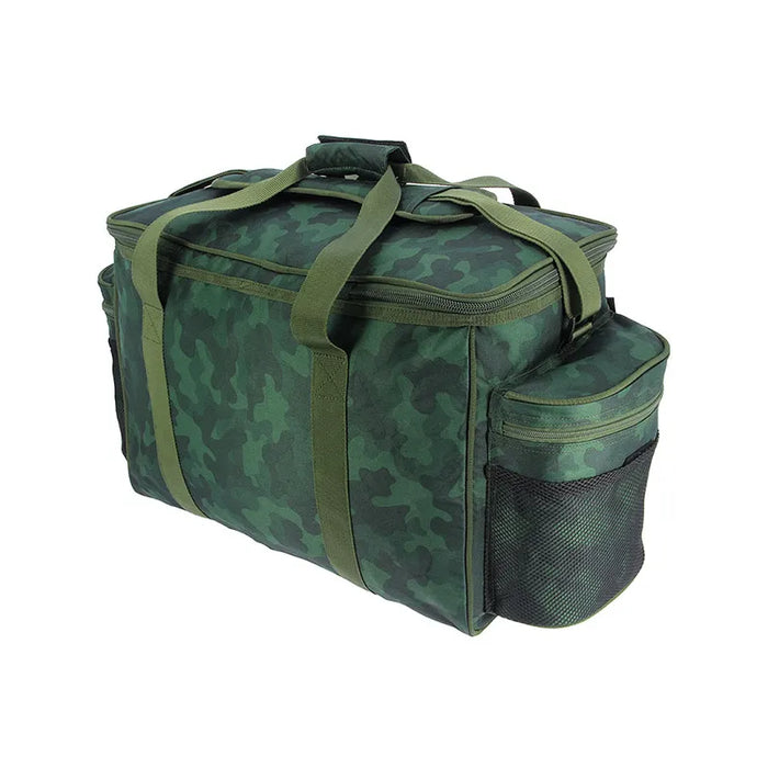 NEW WOODBURY DAPPLE CAMO: A large camo all round anglers carryall, with a large main compartment and 3 generous zipped and mesh external pockets. Padded handles and padded adjustable shoulder strap are included as standard, and it's made from waterproofed 600D polyester with PVC backing.